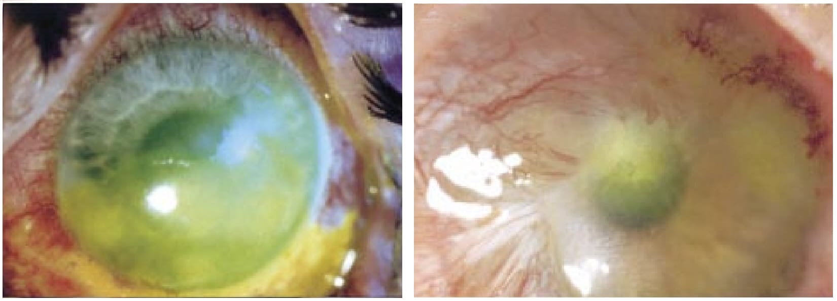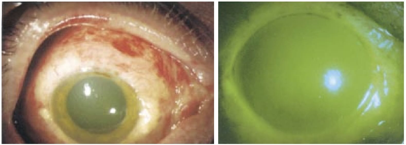 Right: Grade 5 (9.5/60%) ocular surface burn following alkali injury. Nine and a half clock hours of the limbus and 60% of the conjunctiva were involved. Dua 2001