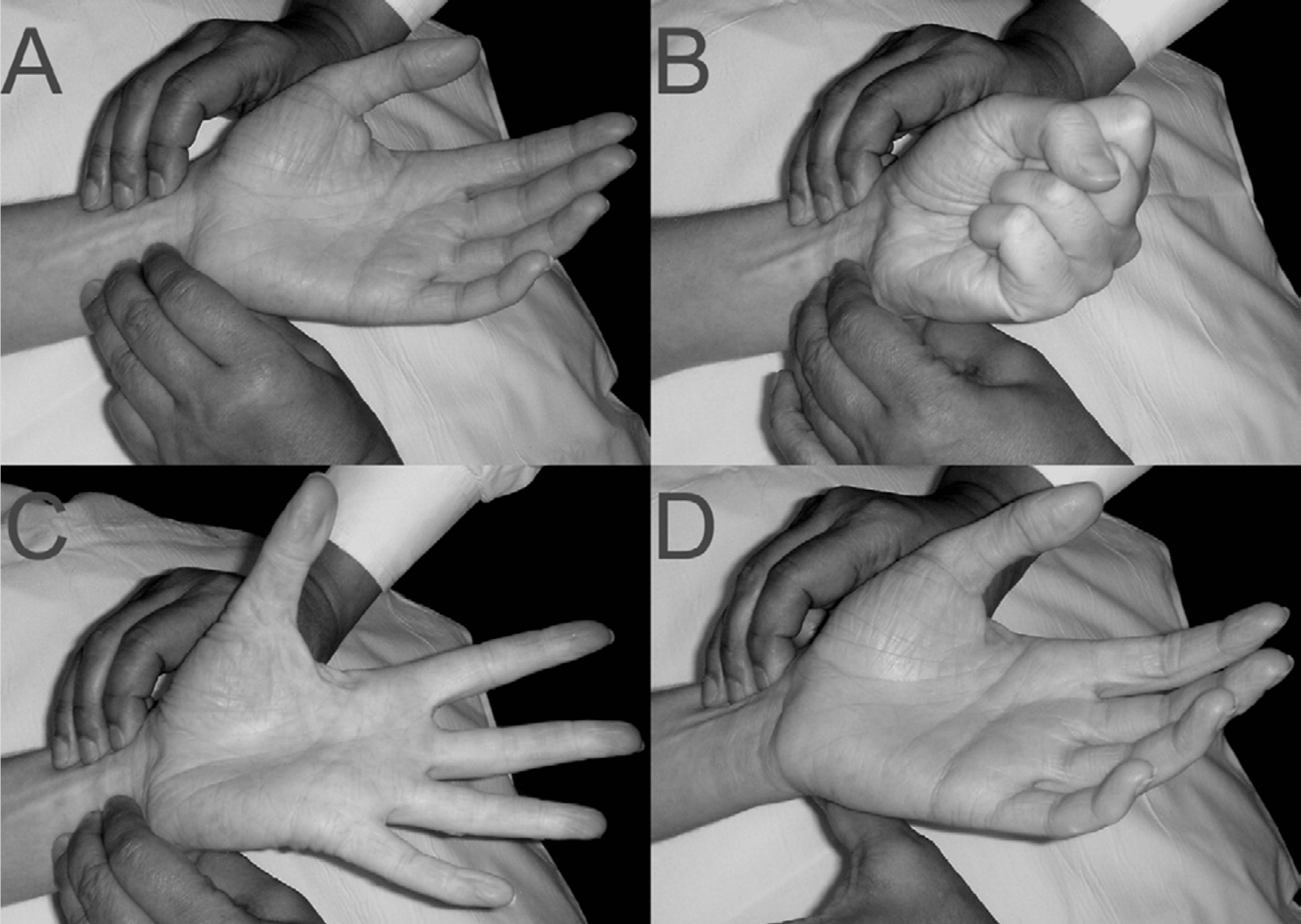 B: Suggested modification: Patient is forced by the examiner’s hand not to hyperextend; told to open the hand rapidly but only partially, and to relax their fingers in the examiner’s hand. The patient’s wrist should relax in a slightly flexed position. Erjup et al 1966