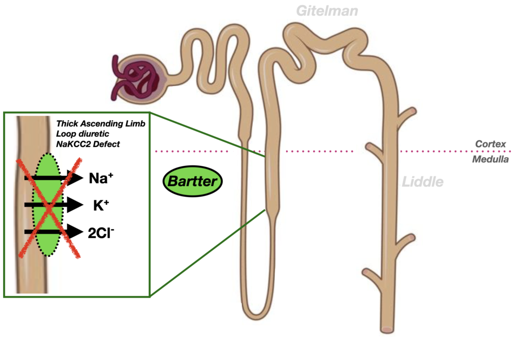 Classically, a defect in the NKCC2 co-transporter of the thick ascending limb causes renal salt wasting, leading to chronic volume depletion. This activates the renin–angiotensin–aldosterone system (RAAS), with juxtaglomerular hyperplasia (the cells which produce renin) and correspondingly high aldosterone levels. However, because the kidney cannot retain sodium, blood pressure stays normal, producing the hallmark of Bartter syndrome: hyperaldosteronism without hypertension. This is a pathophysiological mimic of the loop diuretic effect.