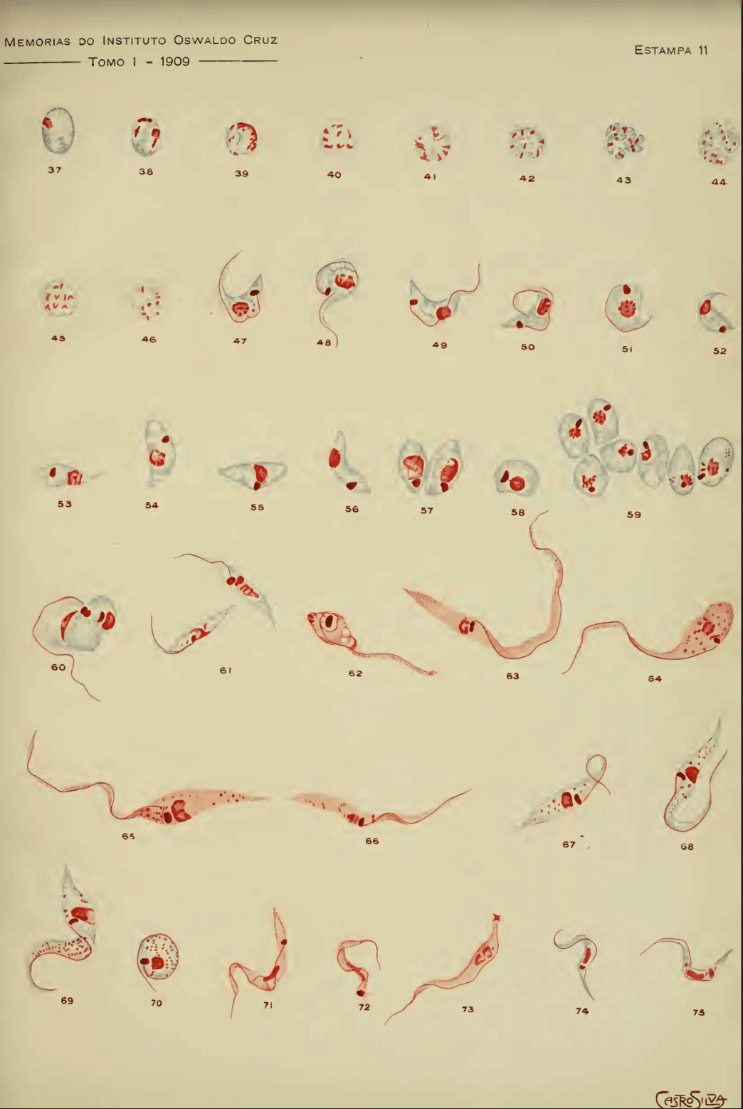 - Chagas C. Nova tripanozomiaze humana: estudos sobre a morfolojia e o ciclo evolutivo do Schizotrypanum cruzi n. gen, n sp, ajente etiolojico de nova entidade morbida do homem. Mem. Inst. Oswaldo Cruz 1909; 1: 159-218