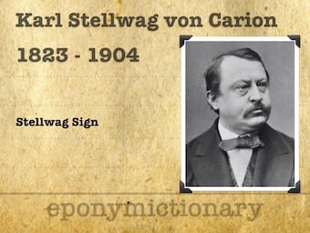 Karl Stellwag von Carion (1823 – 1904) was an Austrian ophthalmologist. Eponym: Stellwag Sign (1869) in Graves orbitopathy