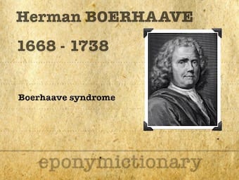 Hermann Boerhaave (1668 – 1738) was a Dutch physician, chemist, botanist and Christian humanist. The father of bed-side teaching. Eponymously affiliated with Boerhaave syndrome following his 1724 description of the death of Baron Jan von Wassenaer, Grand Admiral of the Dutch Fleet.