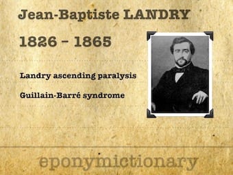 Jean-Baptiste Octave Landry de Thézillat (1826 - 1865) was a French physician. Landry ascending paralysis (1859) as early description of Guillain–Barré syndrome (1916)
