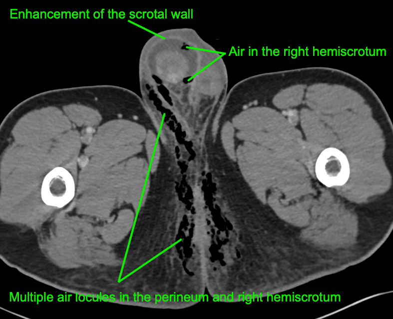 There is also smooth enhancement of the wall of right hemiscrotum and air foci within the scrotal cavity, this is due to infection involving the scrotum.