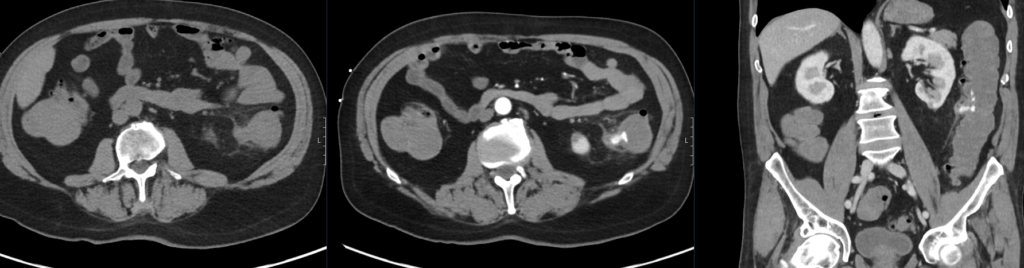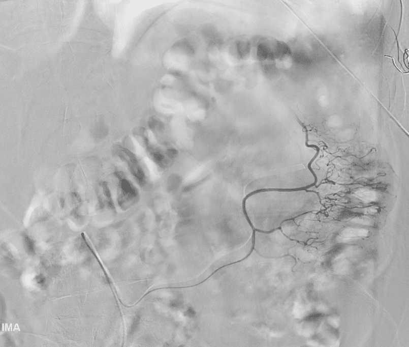 CT angiography is preferred for patients with severe persistent bleeding resulting in haemodynamic instability despite volume resuscitation. Active bleeding is required to identify a bleeding source with a rate of blood loss exceeding 0.35mL/min. The sensitivity of CT angiography in the localisation of gastrointestinal is approximately 90% when there is active bleeding, with detection rates falling to 45% when the bleeding is intermittent (3). Angiographic treatment is more likely to be successful if it is performed within 90 minutes of a positive CT angiogram and involves transcatheter embolization of the bleeding site via microcatheters. Surgery may be indicated for bleeding that can not be controlled with angiographic or endoscopic intervention. This patient was resuscitated with blood products while discussions were had with the general surgical team and interventional radiologist (IR).