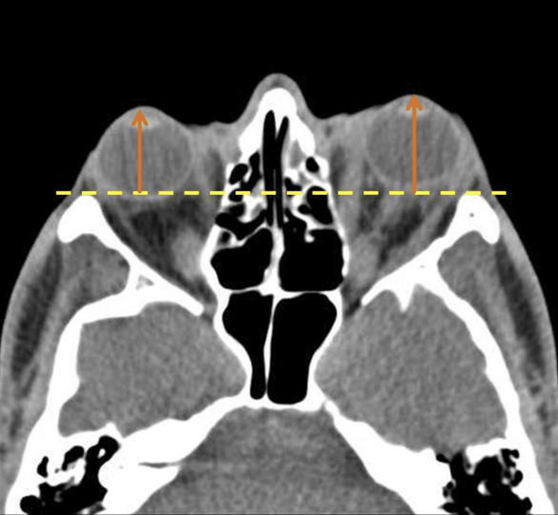 Axial CT images and at a level of the lens. If the distance from the anterior margin of the globe to interzygomatic line exceeds 21 mm, it is compatible with proptosis. In the case above the distance from anterior margin of the globe to interzygomatic line is 23 mm (right) and 25 mm (left). The findings are compatible with ocular proptosis due to thyroid ophthalmopathy.