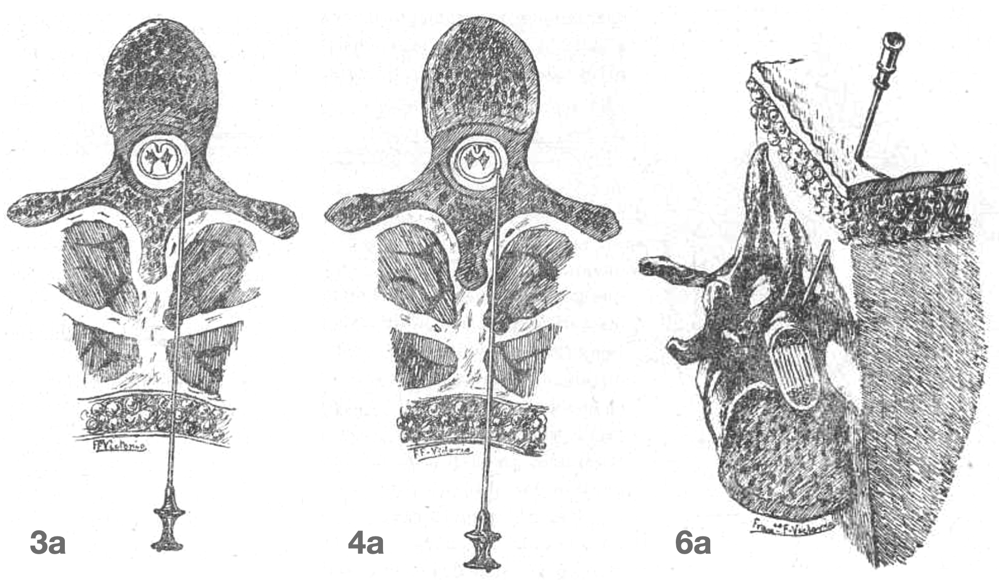 Fig. 3a: Needle in proper position. Fig. 4a: Poor trocar positioning that facilitates dural penetration. Fig. 6a: Schematic representation of the path taken by the needle during perimeningeal (epidural) puncture. Anestesia metamérica, 1921