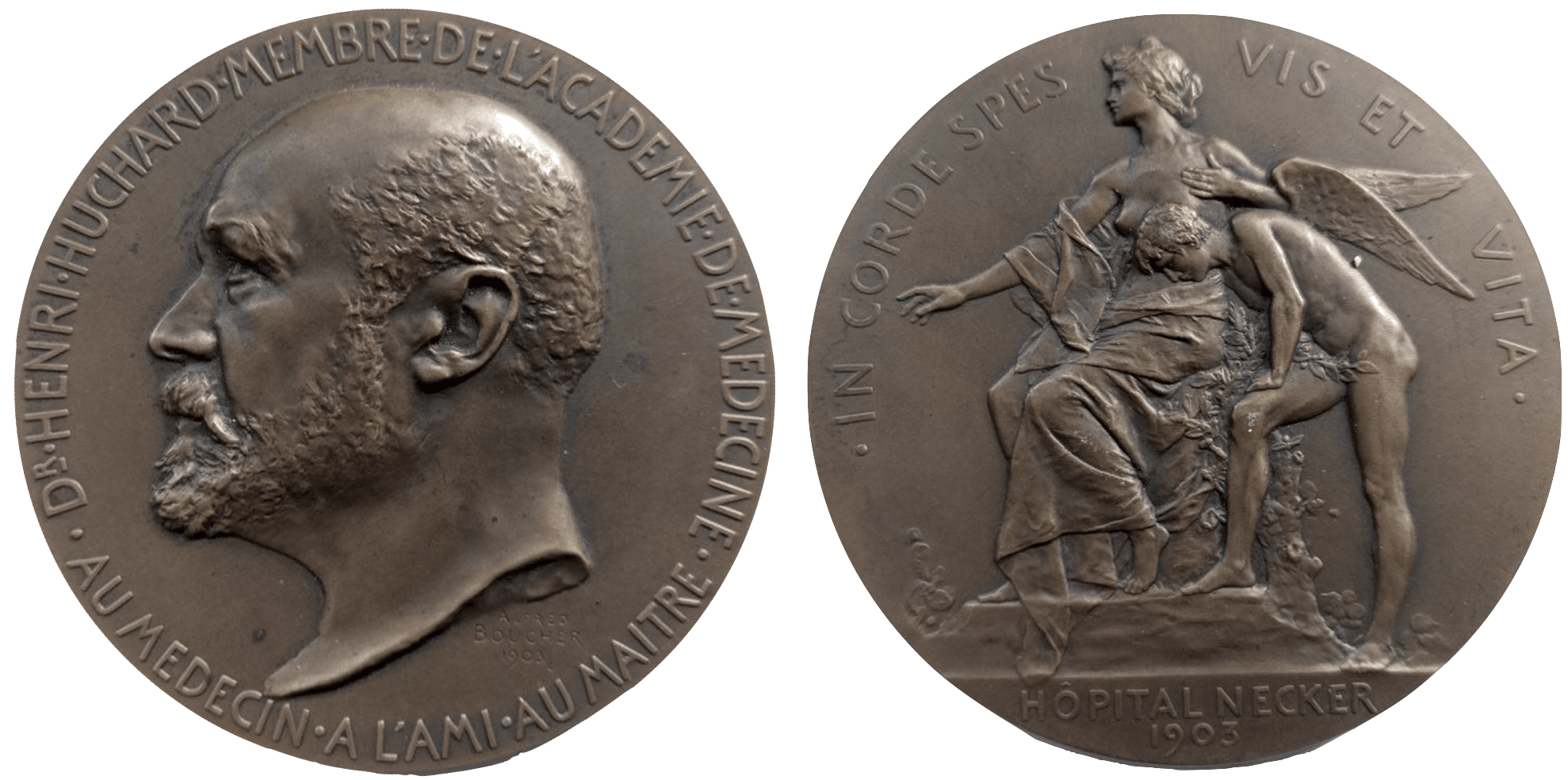 Troisième République Médaille de Henri Huchard is a commemorative bronze medal struck in 1903 to honour Huchard at the Hôpital Necker (Paris). Designed and signed by the renowned French sculptor–medallist Alfred Boucher (1850–1934).