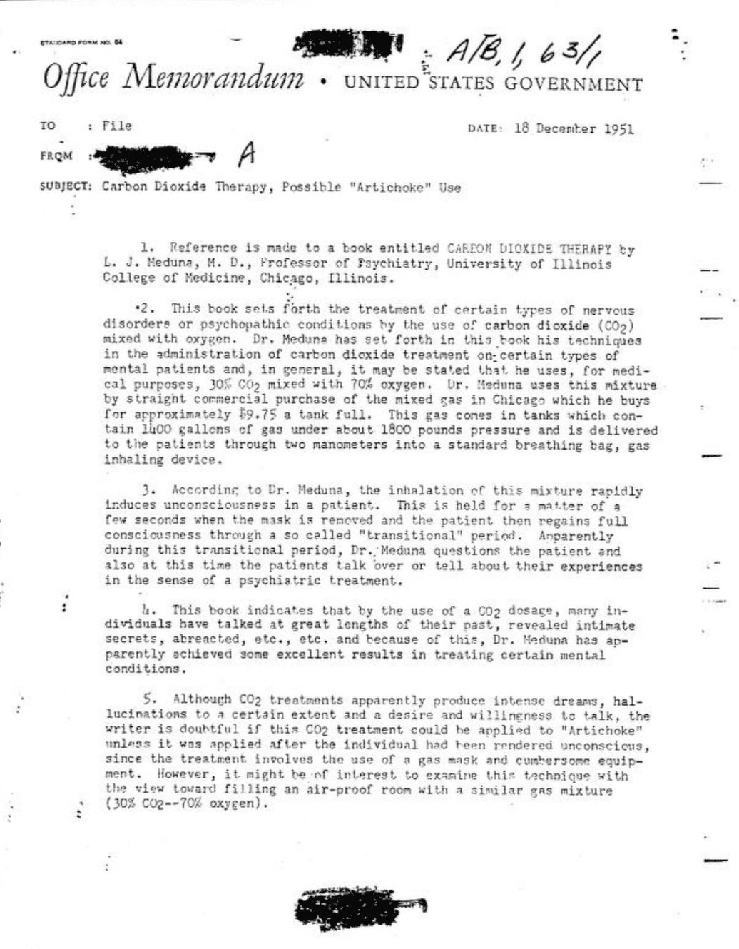 - Carbon Dioxide Therapy – possible “Artichoke” Use. CIA Reading Room 00184442. 1951