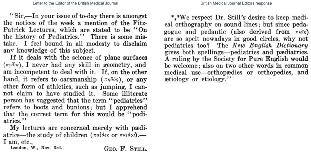 1927 – George Frederic Still (1868–1941) used the BMJ letters page to stage a nerdy (and very Greek) defence of pædiatrics. He argued the word should come from paides (children), not from unrelated Greek look-alikes—reviving a spelling debate that still refuses to die.