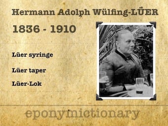 Hermann Adolph Wülfing-Lüer (1836 – 1910) German Surgical instrument manufacturer. His wife Jeanne Amélie Lüer invented the original Lüer syringe in 1895