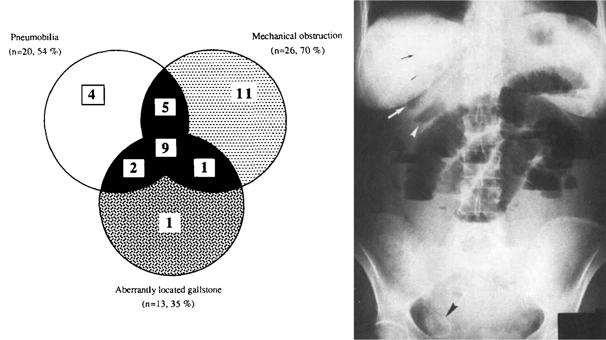 Though specific radiologic signs are absent in about half the patients, a diagnosis of gallstone ileus must be suspected in any elderly female presenting with features of small bowel obstruction. Rigler’s triad of dilated small bowel loops; air in the biliary tree; and a gallstone in an ectopic location, is as valid now as in 1941