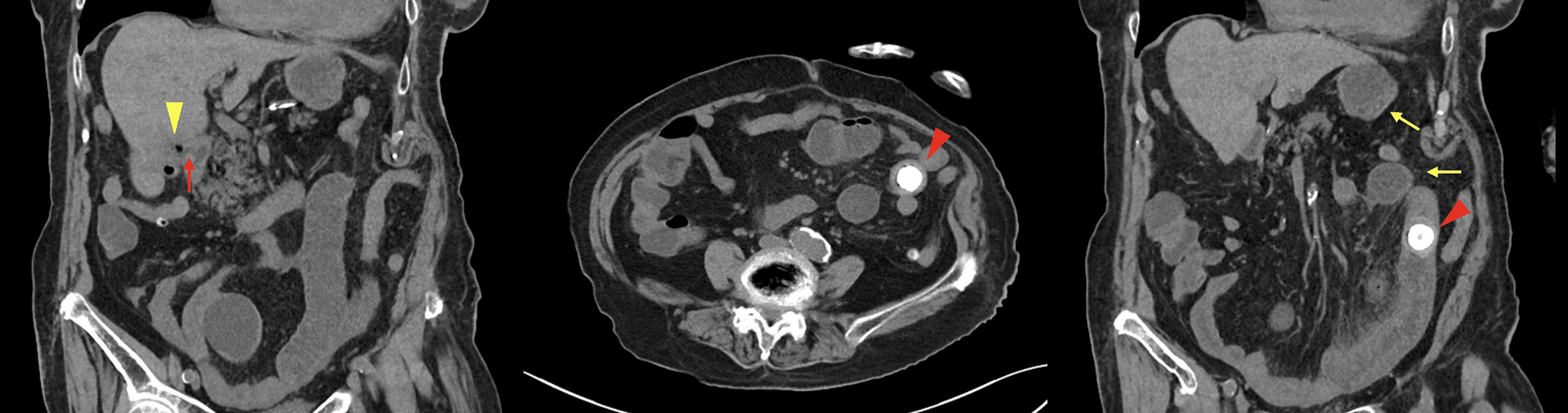 2025 – JMA Journal case by Ono and Kitagawa, a 100-year-old woman presented with left flank pain and vomiting. CT imaging confirmed all three components of Rigler’s Triad: