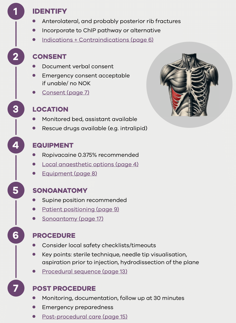 The package walks you through a simple seven-step pathway – Identify, Consent, Location, Equipment, Sonoanatomy, Procedure and Post-procedure care – and covers everything from indications, contraindications and local anaesthetic dosing, to ultrasound anatomy, video walkthroughs, and a practical training and credentialling framework.