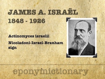 James IsraelJames Adolf Israël (1848 - 1926) was a German surgeon. Eponyms: Actinomyces israelii, Nicoladoni-Israel-Branham sign Mike CadoganAugust 1, 2021