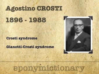 Agostino Crosti (1896 - 1988) was an Italian dermatologist. Crosti syndrome (1951); Gianotti-Crosti syndrome (1955)