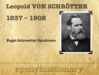 Leopold Schrötter Ritter von Kristelli (1837-1908) an Austrian internal physician. He is known for his description of effort thrombosis (upper limb DVT) eponymously termed Paget-Shroetter syndrome in 1884.
